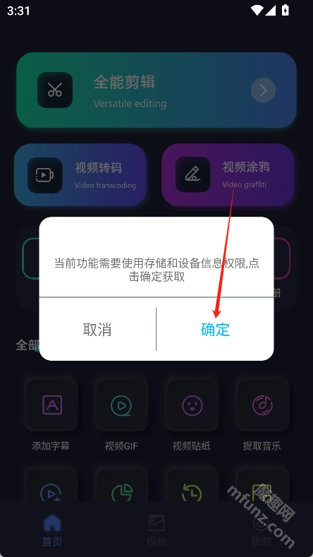 3、点击所需的视频剪辑功能,接着点击“确定”以授予权限
