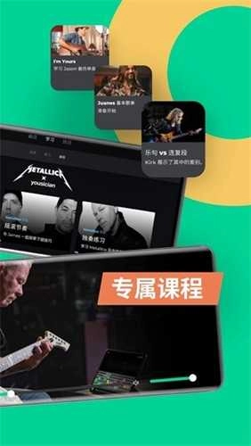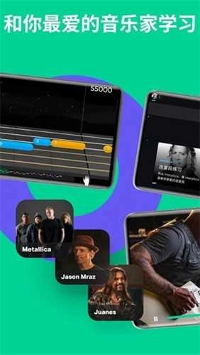 1500多个不同级别的演奏练习任务、数百段视频,涵盖您所需的各种演奏技能:和弦、弹奏、旋律、主音、指弹、乐理、读谱等。