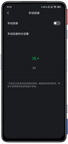 4.手动回录:在黑鲨时刻首页,点击“手动回录”,设置悬浮窗,点击悬浮窗可录制15~60s视频。