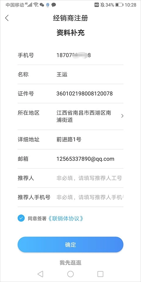 2、随后在打开的经销商注册页面里填写好相关资料,勾选联销体协议,再点击【确定】按钮