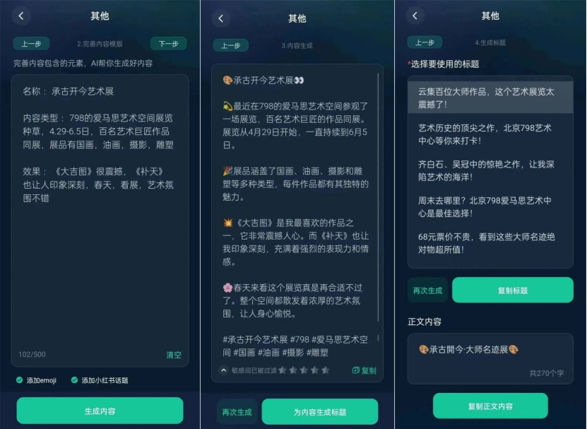 一个机器人而已,我自己编辑些需求给它就行,不用局限在固定格式里。一边打开全文生成功能页面,一边拿出艺术馆的宣传单,把展览信息哗哗一顿输入,接着随意地让灵感岛给内容加上emoji表情:
