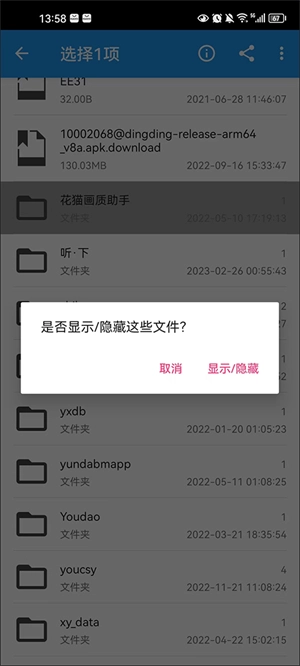 2、用户也能够对部分文件执行隐藏操作,长按文件后,点击右上角的三个点图标即可启用隐藏功能。