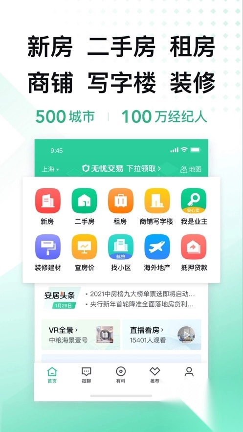 1、海量房源:二手房、新房、租房、商业地产、海外地产;