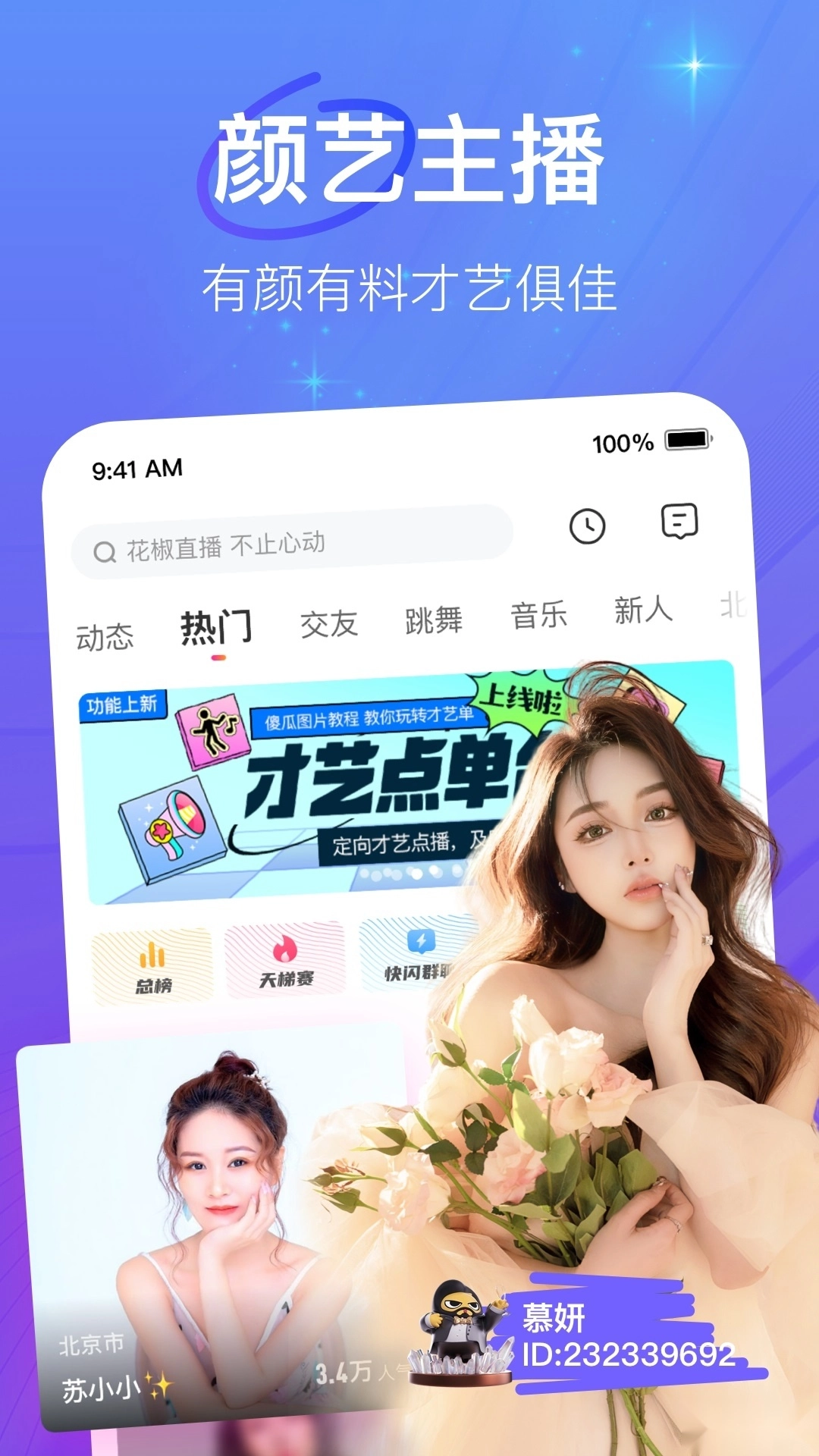 花椒,是一款广受全球年轻用户喜爱的直播交友平台,是当今高颜美女、清纯校花以及型男帅弟的三大聚集地之一。24小时直播不断,动感音乐、清新卖萌、神模仿,有料有颜还会玩转热点,百般花样的潮流直播带给你砰砰心跳,是的,高颜值又时尚的小哥哥小姐姐都在花椒,就等你来pick!