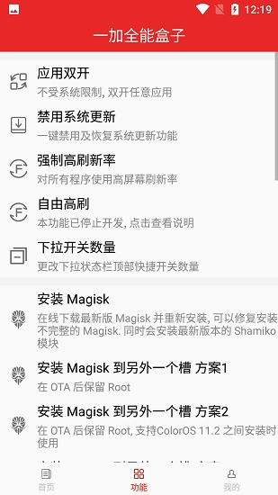 1、一加无限制双开2、禁用/恢复系统更新功能3、一键安装EdXposed4、一键官改Rec支持adb功能