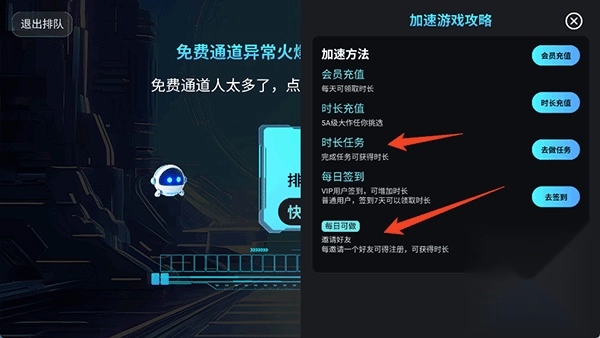 5、免费渠道人多,可通过做任务或邀请好友获取时长和免排队福利。