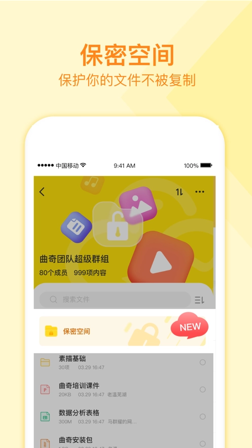 1、只属于你的群组保密空间,口令进入,群员只有查看权限,保护文件不被复制,你的文件你做主;
