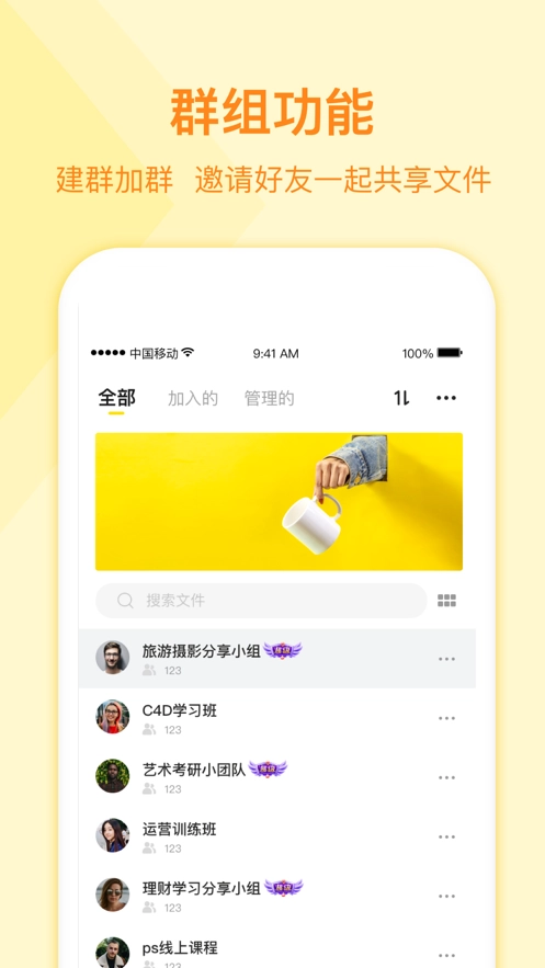 1、群组功能:支持建群加群,群内资源免费共享,无需也能在线预览;