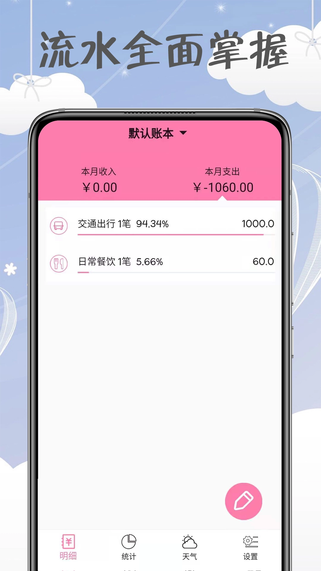 女神记账这是一款简单的记账软件,可以把每日的流水数据全面的掌握,每一笔的开销都可以记录的清清楚楚,操作也是非常的简单的,带来的功能服务也是十分的实用哦!掌上的一款记账笔记,轻松的来记录更加的全面。