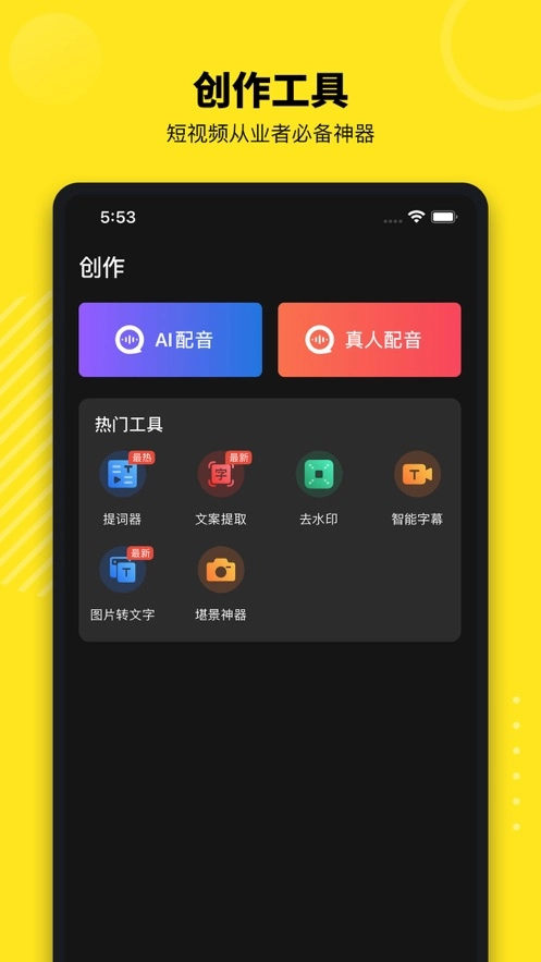 1、一站式智能工具箱,文字转语音、真人配音、提词器、自动加字幕、一键去水印、勘景神器等等功能;