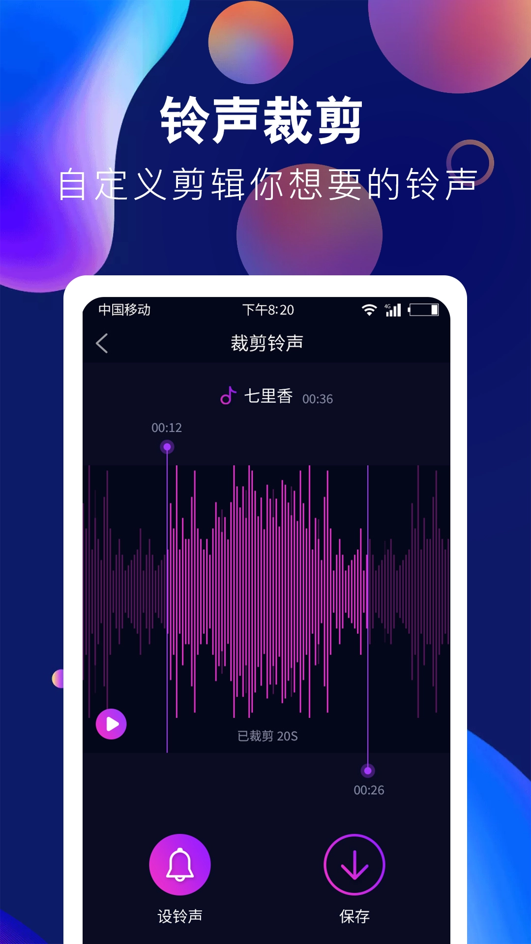 【铃声剪辑】把您喜爱的音乐文件剪辑出一段加以保存。