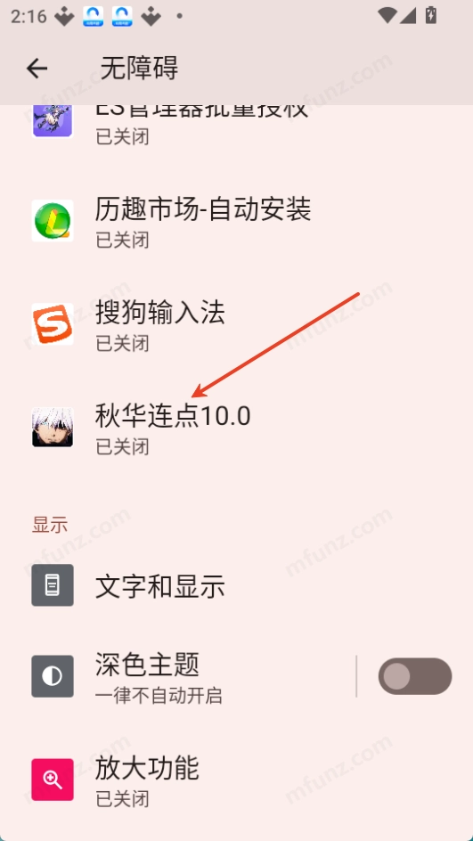 1.打开手机设置,在无障碍列表,找到秋华连点10.0