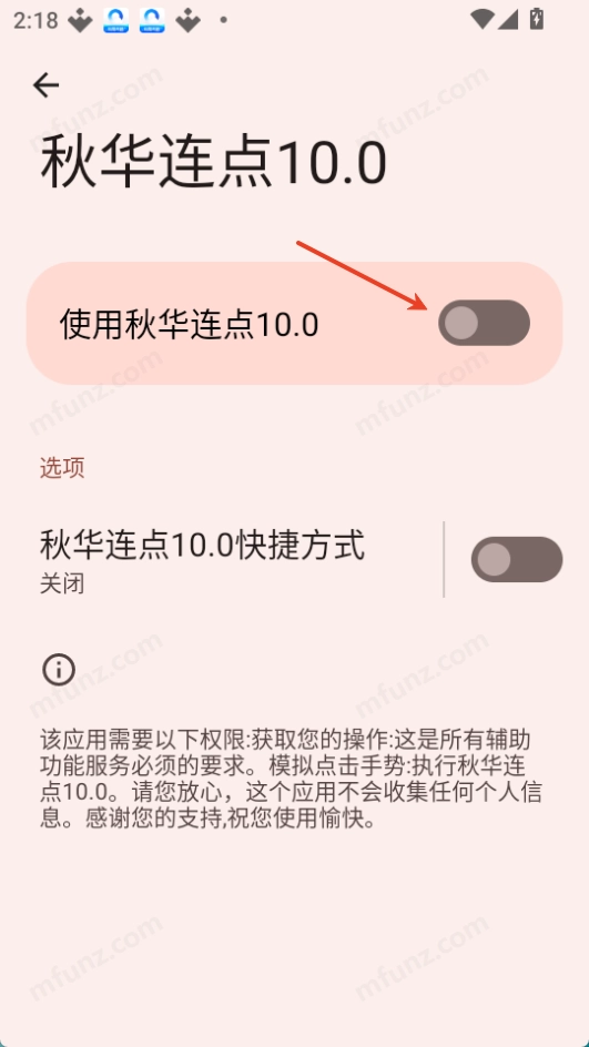 2.然后点击进去,将秋华连点10.0右边的开关打开。