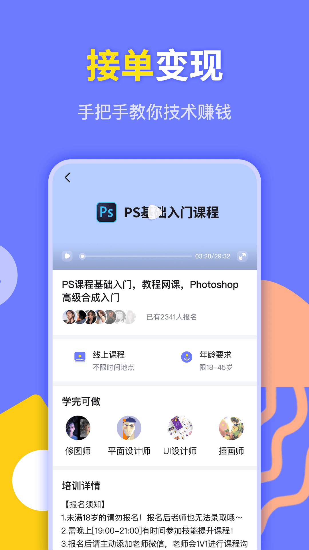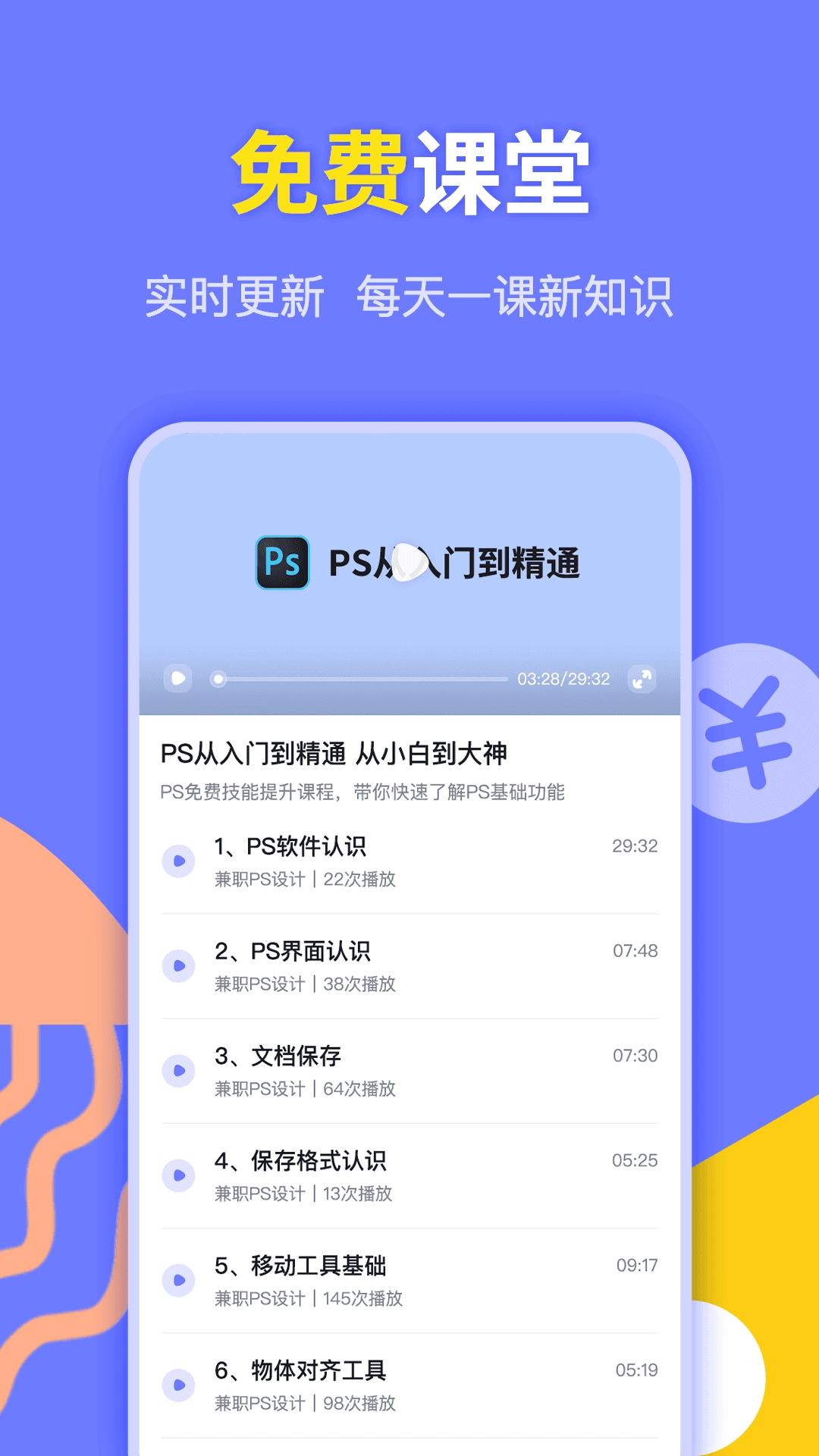 速学兼职PS设计是一个PS软件学习平台,让用户能快速掌握学习技巧,提升自己的PS技术水平,所有课程都能免费学习,还能在平台中自由接单,让所有想要学习PS的用户都能如愿以偿,每天都能在手机上进行学习,从PS小白到PS大神,让用户能快速接单获得收益,同时能轻松提升自己的能力。