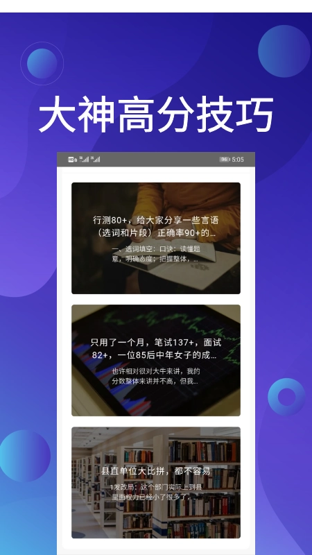 2、提供大量公考技巧、知识,精选题库,在线学习,掌握更多实用技巧,让公考测试更轻松、更省心。