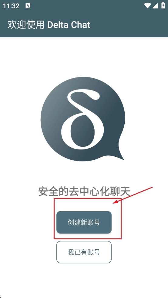 2. 点击“创建新账号”,使用自己的邮箱账号创建deltachat账号。