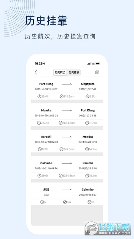 5.历史航次:查看船舶挂靠港口,历史航次,到港时间,离港时间,航行距离。