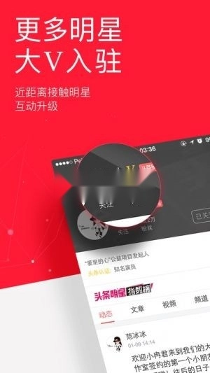 超多明星入驻今日头条开通发布账号,更新消息动态。你可以直接关注评论点赞,不错过 TA 发布的每条资讯,与你心中的明星大V拉近距离,互动升级!