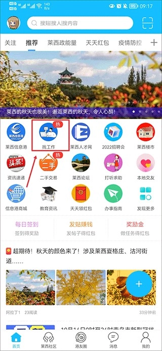 1、打开莱西信息港,在首页中点击找工作