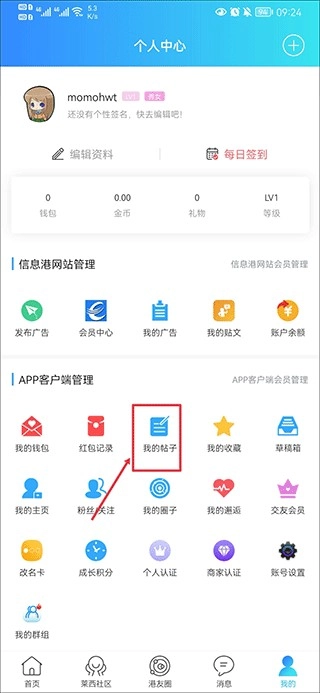 1、在我的界面中,点击我的帖子