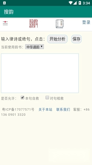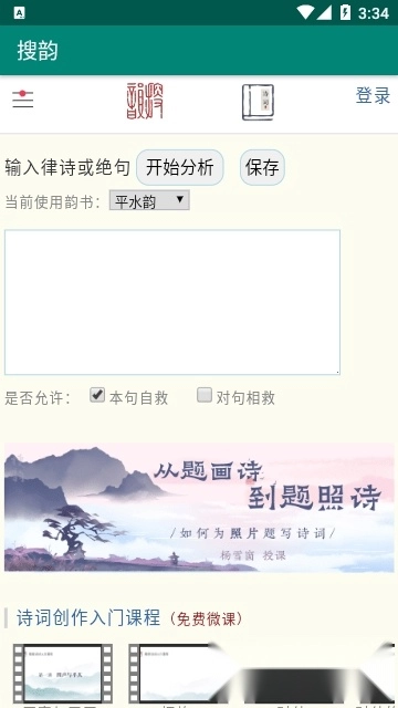 律诗校验搜韵软件手机版是一款可以在线搜索诗词韵律的工具,使用本软件输入律诗或者绝句,点击分析即可为你检测当前所使用的韵书类型,操作简单易上手,超多优质韵律文章等你阅读,对软件感兴趣的话不妨点击试试!