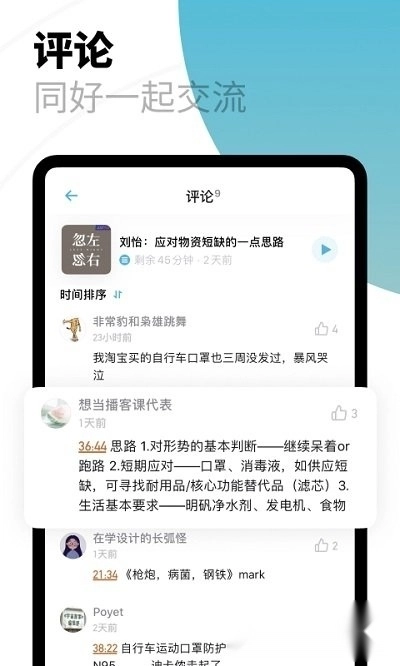 界面特别清新,比其它界面简洁,可以根据听到哪一段进行评论,评论区有很多令人感同身受的观点。