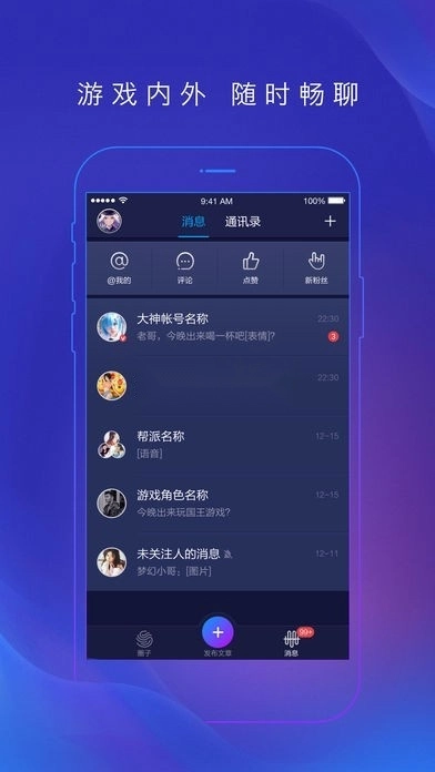 ——游戏内外,随时畅聊角色一键绑定,游戏内外互通聊天,随时随地与游戏好友交流分享,打造一个属于您的游戏朋友圈;