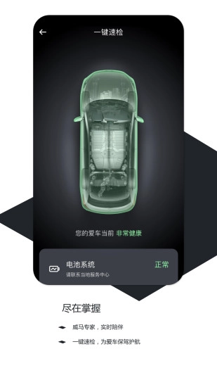 3、威马专业技术人员,在线实时守候,为您一键快速检测车辆,为您的爱车提供全面守护。