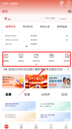1、功能定位清晰:聚焦计算机一级考试范畴,融合题库练习、模拟测试、直播授课以及资讯服务等关键功能。