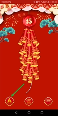 1、开启电子鞭炮应用,进入主界面后,点击页面底部左侧那个形似火堆的图标(即下图绿色箭头指向的区域,点击此处就能燃放电子鞭炮)