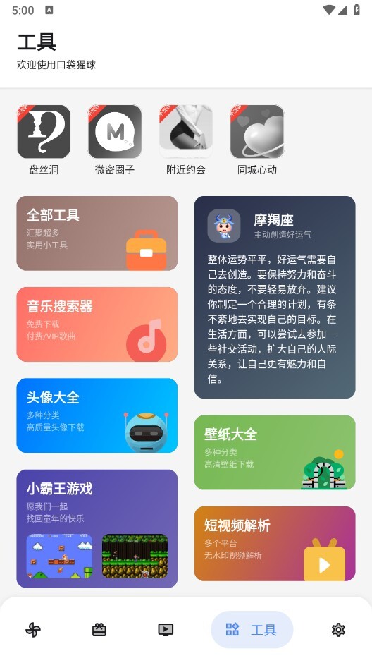 口袋猩球是一个资源丰富的手机软件库,这里汇集了大量热门应用和游戏,用户可以在这里搜索喜欢的应用使用,软件运行速度快,资源丰富全面,能满足每位用户的需求。你还可以在这里找到许多实用的小工具,比如音乐搜索器、短视频解析、壁纸头像大全、星座运势解析等,超多实用功能为你呈现。