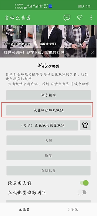 1、在手机上启动自动连点器应用,点击“设置辅助功能权限”选项,随后在系统设置里开启“自动连点器”的模拟点击权限;