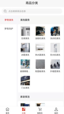 1、商品分类功能里涵盖了各类设备清洗项目,像空调清洗、油烟机清洗、冰箱清理等都包含在内。