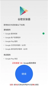 6、打开应用程序后,依据提示完成Google账户管理、服务框架、Google市场、play服务等组件的安装。
