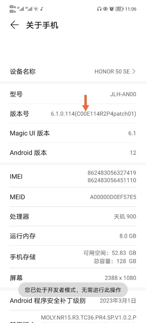 2、打开手机设置,找到手机版本号,接着连续点击该版本号,即可进入开发者模式。