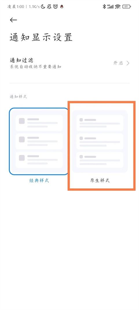 5、回到设置将通知显示设置改成原生样式。
