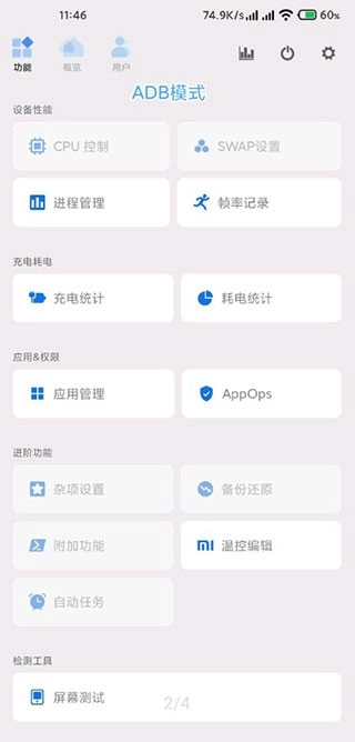 这部分工作差不多占了Scene5首个公测版一半的开发时长。最明显的变化是,新增了基础模式与ADB模式,就算是没有ROOT权限的用户,如今也能使用一些实用的小功能,像帧率统计、进程管理、应用管理以及性能监视器。另外,采用全新底层架构的Scene5,在运行时不会再频繁弹出已获取Root权限的提示了。