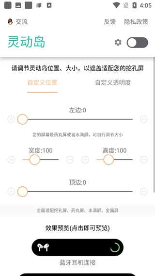 5、完成权限设置后继续点击开启灵动岛功能。初始状态下,灵动岛默认从左上角展开,用户可通过【自定义位置】选项调整其显示位置,同时也能设置【自定义透明度】来调整视觉效果。