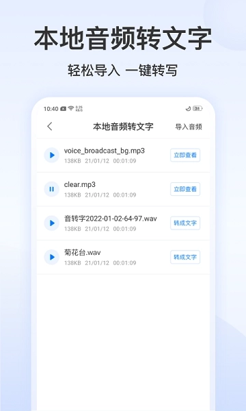1、录音文字管家是一款可实现音频转文字功能的工具,适用于课程笔记、会议笔记、采访笔记等各类内容的记录场景。用户只需导入本地录音文件,即可快速完成语音转文字操作,从而更好地满足日常工作中的相关需求。