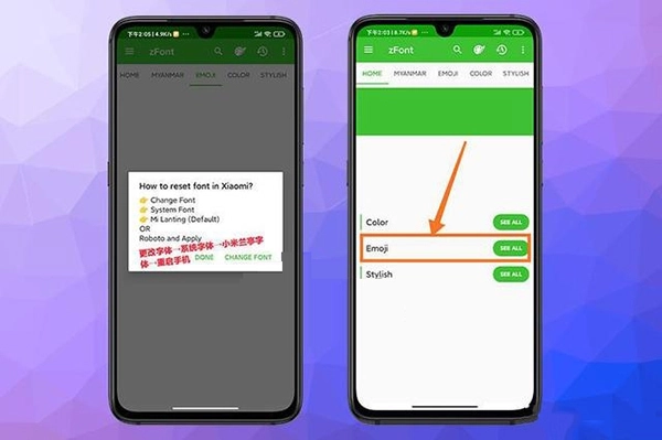 4、重启设备后再次打开zfont应用,进入Home页面,选择emoji选项,接着点击See All(看全部),完成以上操作步骤后,zfont的emoji表情包就能正常使用了。