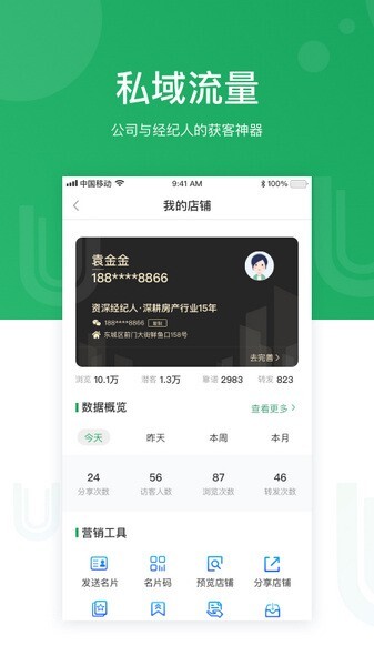 【外部赋能】支持一键同步58同城、幸福里、房天下等主流流量平台;配备超完善的分享工具;拥有实时结算佣金的系统;具备完善的权证及售后体系等。