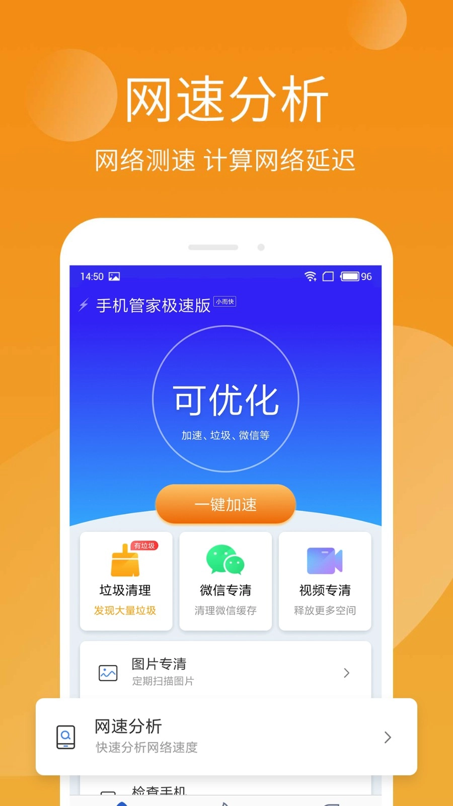 1、一键清理后台无用进程,释放手机内存空间,有效解决卡顿问题,让手机运行速度显著提升。