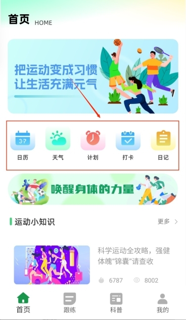 1、在首页就能找到日历功能,借助它可以查看自己运动的次数和对应的日期。