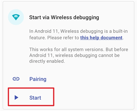 适用于Android 11及更高版本的无线调试功能可通过无线方式启动,该启动方式无需连接电脑。不过受系统限制,设备每次重启后都需要重新执行启动操作。