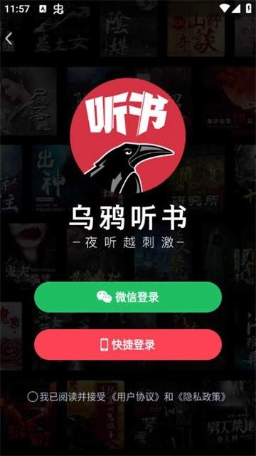 打开乌鸦听书后,先点击阅读同意,再通过微信登录或快捷登录的方式进入首页。