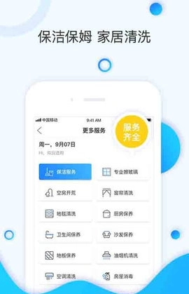 保洁服务涵盖日常保洁、深度保洁、开荒保洁、专业玻璃擦拭以及房屋消毒等项目。