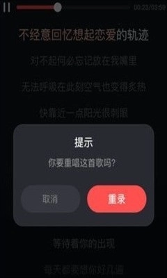 4.演唱结束后,若歌曲未完整演唱完毕或者想要重新录制,系统会弹出提示框询问:“你要重唱这首歌吗?”,此时点击“重录”按钮就能重新开始演唱。