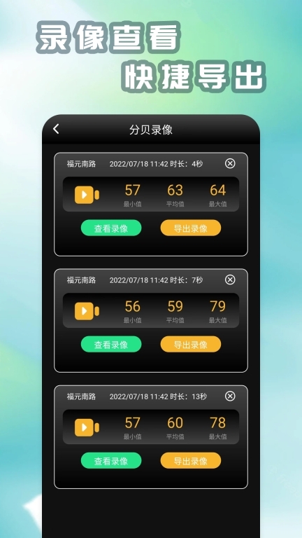 这款软件有不少突出特性:它可利用前后摄像头完成拍摄与录像操作,还能精准记录噪音出现的具体位置以及对应的噪音数值。照片和录像提供流畅、标准、高清三种清晰度选项,用户能依据自身不同需求挑选合适的清晰度,并将内容保存到手机相册里。软件首页的图标设计便于用户即时测试现场噪音,同时记录下噪音的位置、峰值、最高值、最低值和平均值。此外,首页还设有分贝标准对照功能,能帮助用户更清晰地了解噪音水平,从而开展有效的噪声管理工作。