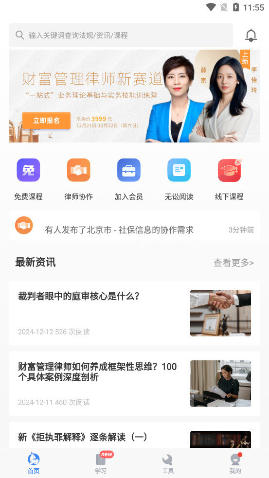 无讼律师App,是百万法律人专属的专业学习、工作与交流平台。平台提供丰富优质的专业内容推送,具备智能高效的案例与法规检索功能,还能为用户对接靠谱且专业的律师合作资源,同时涵盖大量实务性强、干货满满的法律课程。