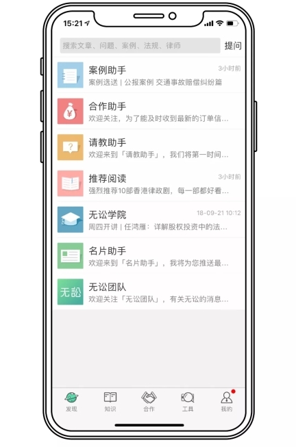 【发现】频道集合了无讼App各主要功能的消息推送,堪称新消息的“集中地”。此外,频道顶部的搜索栏支持直接检索分散在不同频道里的内容,能让用户更便捷地查找所需信息。